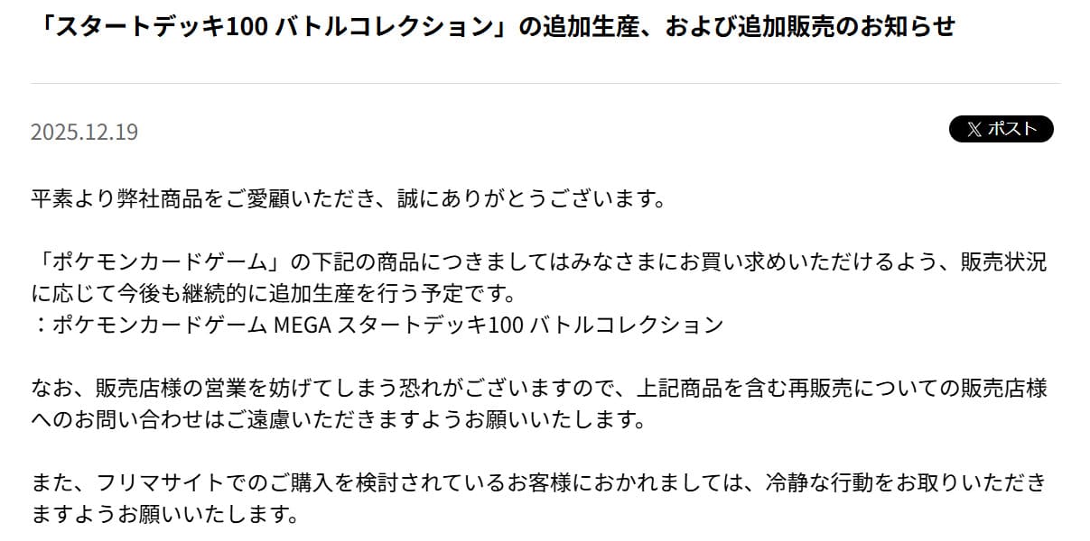 ただし、ポケモンカードゲーム公式より「販売状況に応じて今後も継続的に追加生産を行う予定」