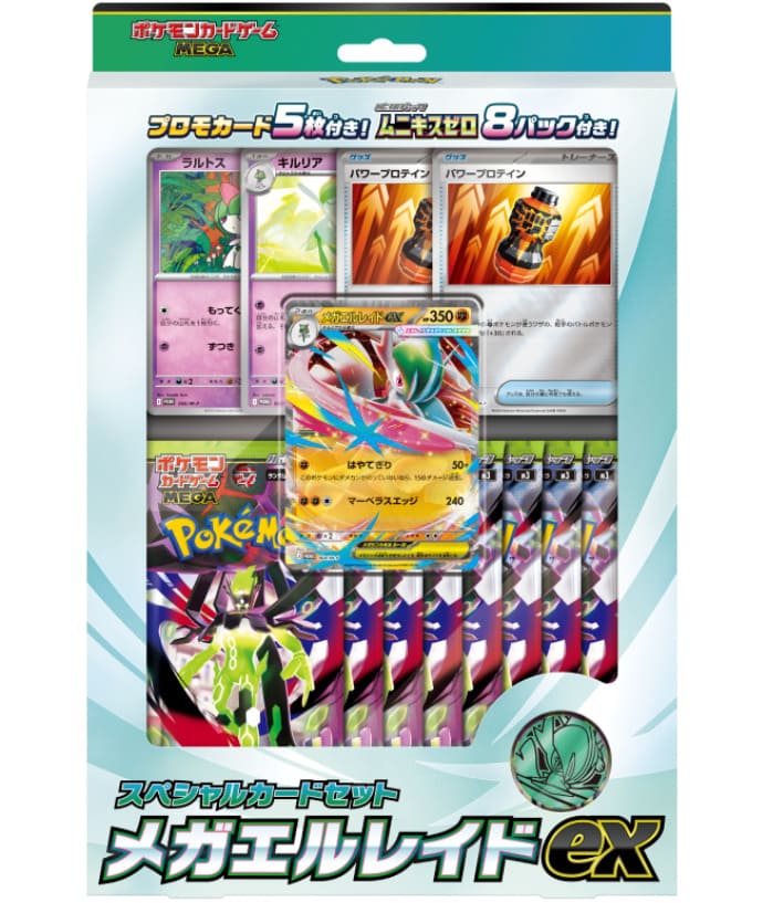 | 内容物 | プロモカード「メガエルレイドex」(キラ仕様)×1枚 プロモカード「パワープロテイン」(キラ仕様)×2枚 プロモカード「ラルトス」×1枚 プロモカード「キルリア」×1枚 拡張パック「ムニキスゼロ」×8パック ポケモンコイン×1枚 |